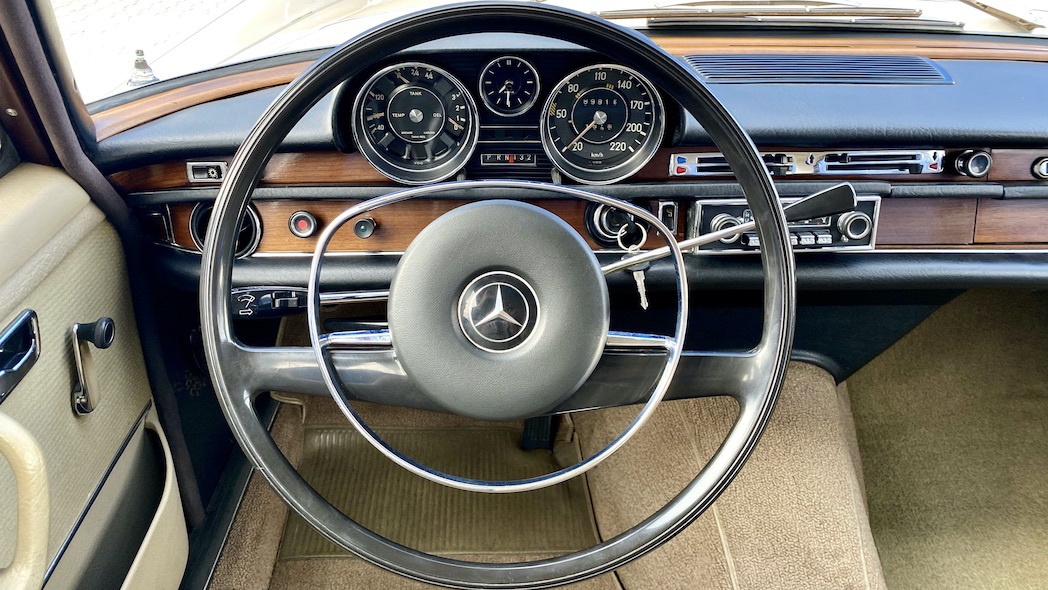 Dieses Stück deutscher Automobil-Geschichte stammt aus erster Hand und wurde im April 1969 auf einen im März 1899 geborenen Zahnarzt aus Süddeutschland zugelassen, welcher zu diesem Zeitpunkt schon 70 Jahre alt war. Anfang des Jahres 1976 verstarb dieser und seine im Mai 1914 geborene Frau meldete den Mercedes-Benz am 29.04.1976 auf sich um. Im November 1990, im Alter von bereits 76 Jahren, zog die Witwe zu Verwandten nach NRW, um nicht in ein Altersheim ziehen zu müssen. Das Fahrzeug wurde am 10.12.1990 in Wuppertal abgemeldet und anschließend in der Garage einer Wegberger Villa mit Fußbodenheizung abgestellt und dort fast auf den Tag genau 30 Jahre lang geparkt.