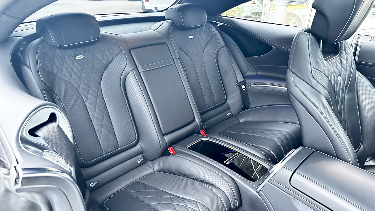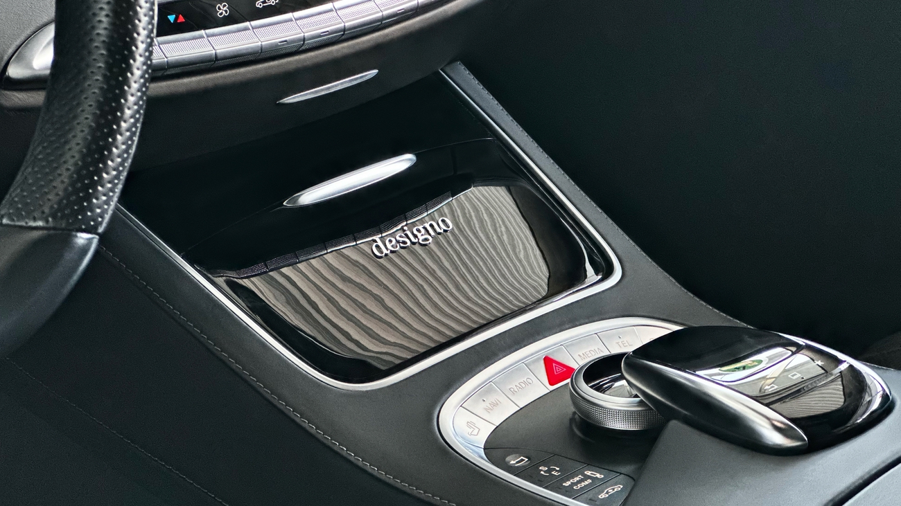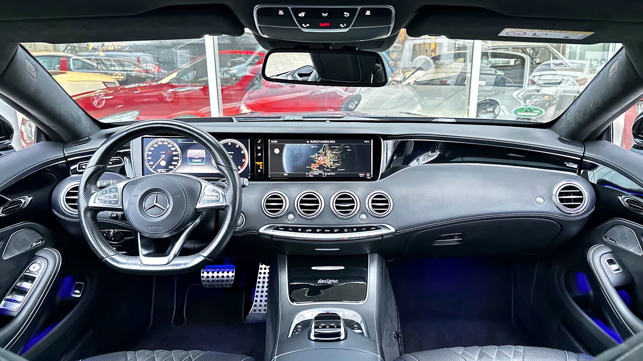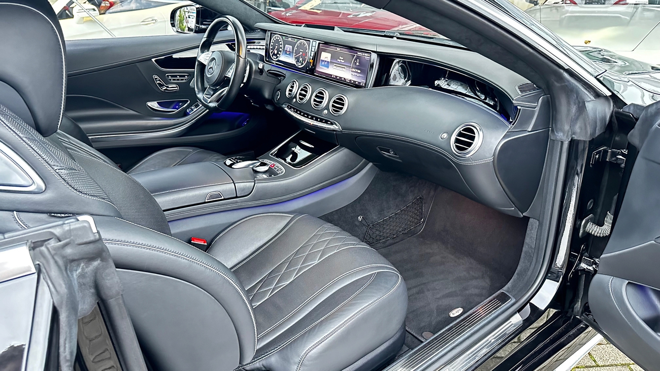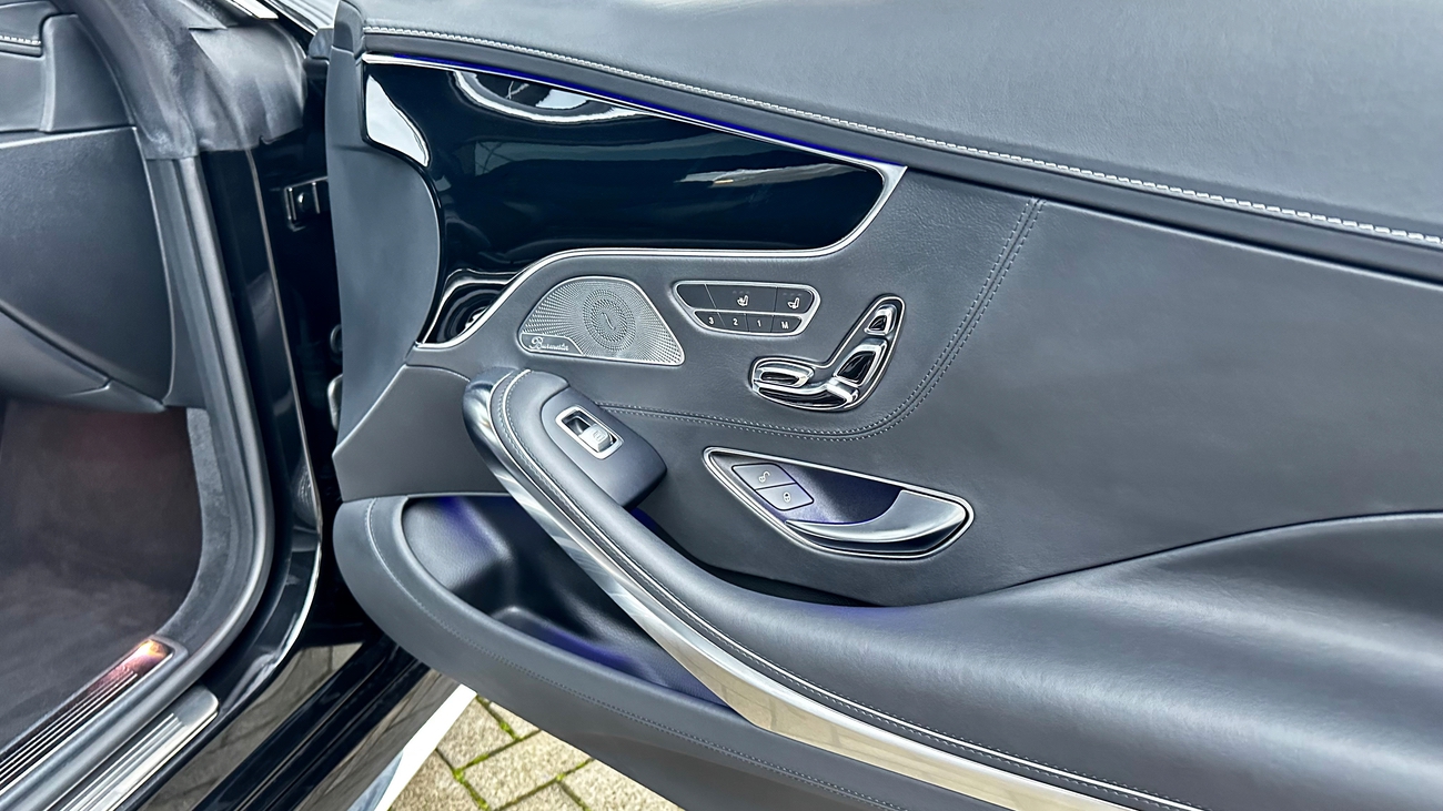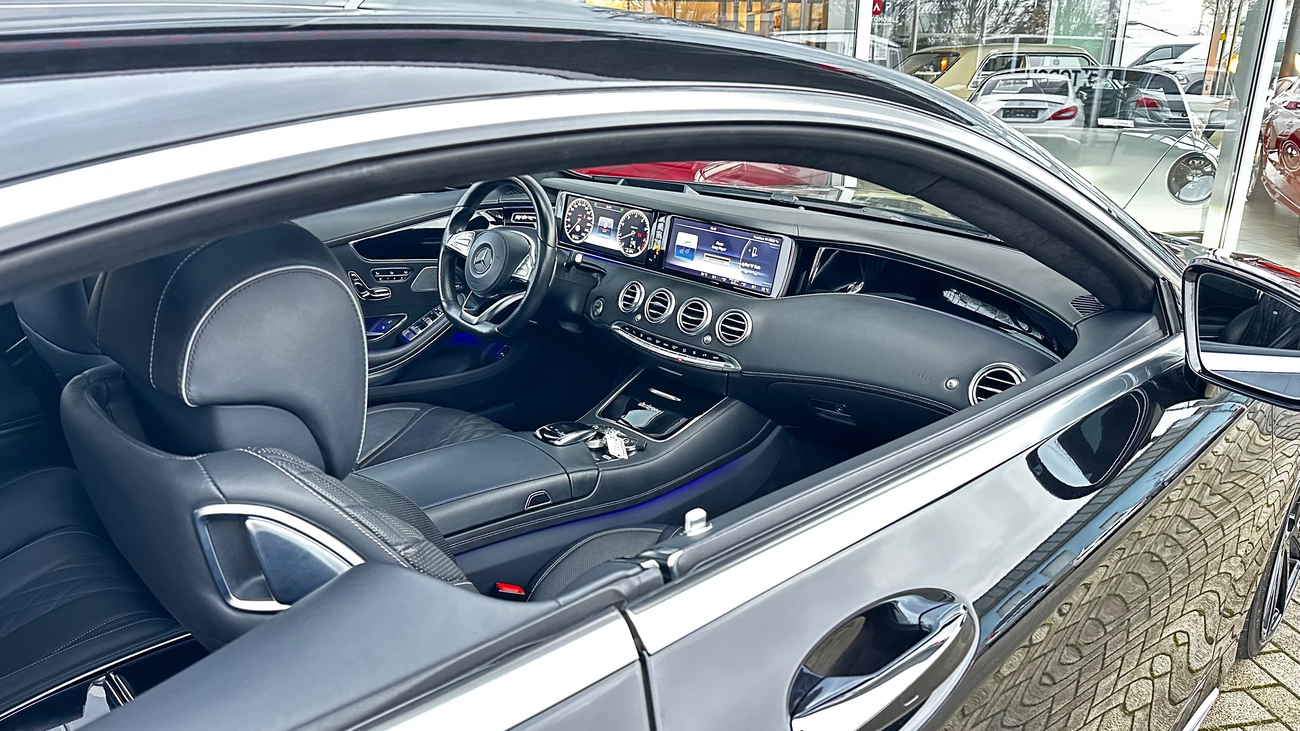 Dieses S-Klasse Coupé ist eine deutsche Ausführung und neu in unserem Bestand. Das schwarz gehaltene Interieur wirkt durch die Verwendung hochwertigster Materialien und Verarbeitungsqualität, äußerst edel. Die Designo-Vollledersitze sind perfekt gepolstert und bieten höchsten Komfort. Selbst das Nappa-Lederlenkrad liegt gut in der Hand und vermittelt ein Gefühl von purem Luxus und Exklusivität. Alles in allem ein unfassbar luxuriöses Coupé mit der Eleganz einer Mercedes-Benz S-Klasse. Weder die Vollledersitze noch das Lenkrad zeigen sich abgenutzt. Auch dem restlichen Innenraum kann ein ausgesprochen gut erhaltener und gepflegter Zustand entnommen werden.