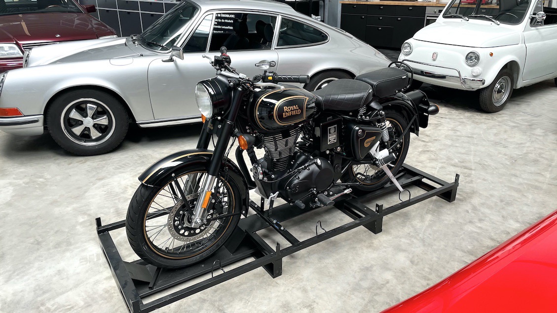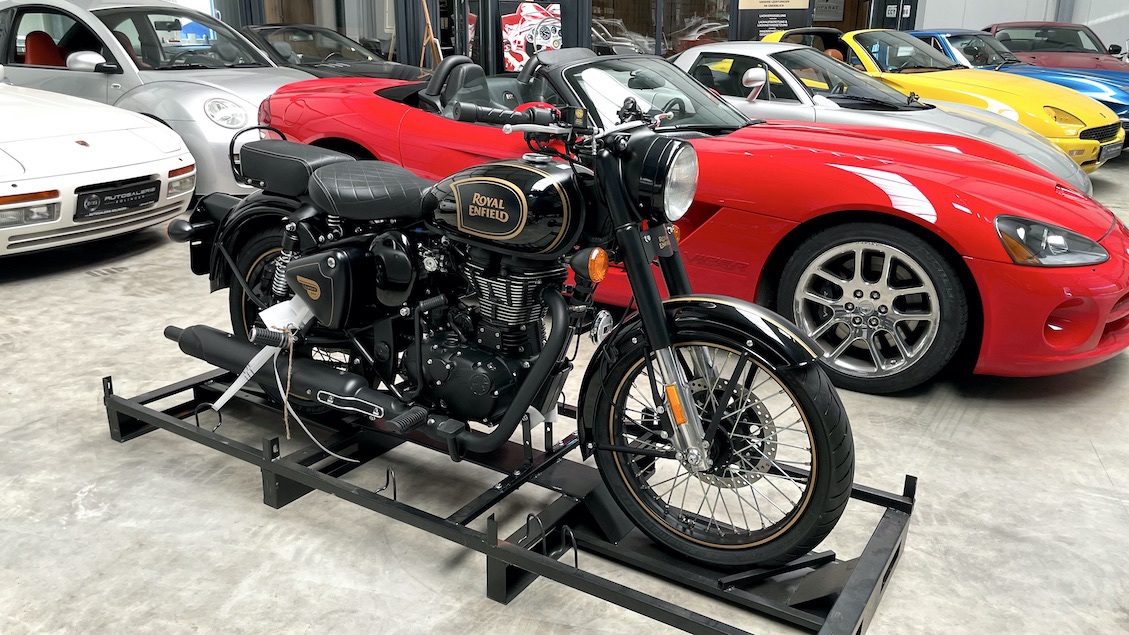 Die Maschine steht im Auslieferungszustand auf dem original Transportgestell. Auf dem Tachometer sind nur die 3,8 km Werks-Testfahrt erkennbar.